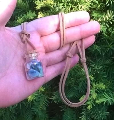 Tento amulet v podobě skleněné lahvičky plné drobných minerálních kamínků je krásným talismanem pro každodenní nošení i dekoraci. Každá lahvička je ručně plněná a navázaná, díky čemuž je každý kus naprostý originál. Minerální kamínky jsou náhodně namíchané, takže žádné dvě lahvičky nejsou stejné — přesně vidíte, co kupujete.
