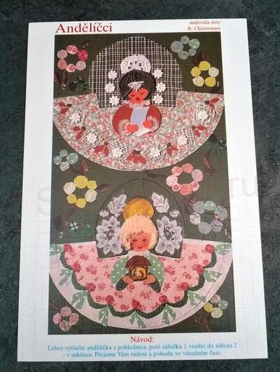 Andílek, anděl, pro štěstí od zdravotně postižených umělců namalováno ústy Ruth Christensen. Nakladatelství UMÚN, který pomahá podporovat tělesně postižené umělce malujicích ústy a nohama.