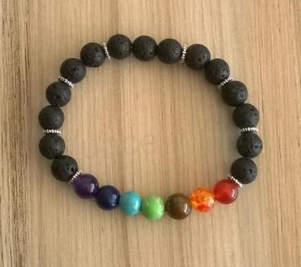 Čakrový náramek, čakrový minerální náramek, čakrové náramky s lávou a minerálními kameny v barvách sedmi čaker vám pomůže očistit, uvolnit a harmonizovat čakry a nastolit v těle rovnováhu. Popis čakrových center ZDE. Nárámek se skladá ze 7 minerálních kamenů - ( ametyst, lapis lazuli, tyrkenit, jaspis zelený, tygří oko, jantar, granát ). Minerální kuličky jsou navlečeny na dvojité pružné gumičce, náramek dobře drží a přizpůsobí se.