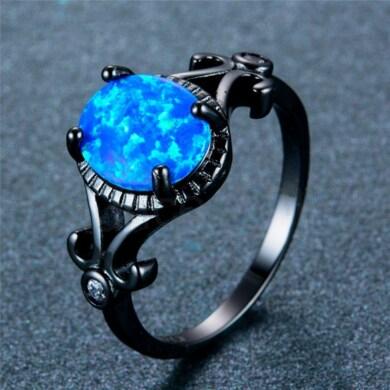 Krásný pokovaný černý modrý oheň, opálový (imitace opálu), prsten (černé zlato) glamour šperky, pro ženy, dívky. Ručně zpracován, dokonalá jemná práce, jedinečný design činí tento prsten jedinečným. Uprostřed prstenu modré opály, zdobené do půlky čirými zirkony, nádherná kombinace. Prsten má speciální černou úpravu. Jedná se o český styl. Modní doplněk k ostatním šperkům, krásně ladí. Prsten je zvláštní svou originalitou a krásou.