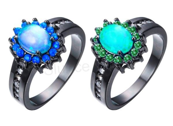 Krásný černý prsten glamour šperky, pro ženy, dívky. Ručně zpracován, dokonalá jemná práce. Uprostřed prstenu syntetický opál, buď v modrém provedení - zdoben modrými zirkony, nebo zelenéný opál, zdoben zelenými zirkony, navíc prsten má do půlky bílé zirkony, nádherná kombinace, z kvalitního kovu. Prsten má speciální černou úpravu. Jedná se o český styl. Modní doplněk k ostatním šperkům, krásně ladí. Prsten je zvláštní svou originalitou a krásou.