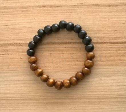 Dřevěný korálkový náramek z přírodního dřeva na způsob Jin a Jang, krásné spojení s přirodou a přirozeností. Barevnost dřevěných korálků se hodí ke všem barvám oblečení. Náramek je určen jak pro pány, tak pro dámy. Harmonicky modní náramek je v lehké barevné kombinaci různých korálků. Náramek je navlečen na pružné pevné pružence ( gumičce), která dobře drží a nehrozí její poškození. Výhodou náramku je, že korálky nikde netlačí, ani nevíte, že ho máte. Zacházejte s ním jako se šperkem, nedoporučuje se dlouhodobé namáčení. Náramek je originál, jedná se o ruční výrobu.