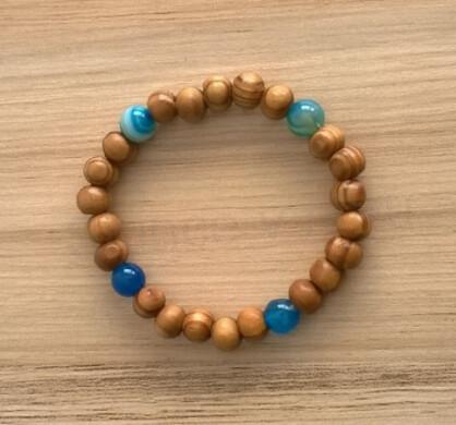 Minerální náramek s achátem a dřevěnýma ozdobnýma korálkama. Náramek je na dvojité gumičce, dobře drží a snadno se přizpůsobí. Náramek je moderní, hodí se ke všem modním doplňkům.