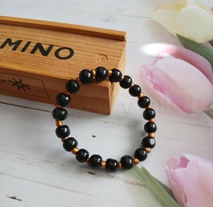 Náramek tvořený převážně lesklými černými dřevěnými korálky, mezi nimiž pravidelně prosvítají menší zlatavé ozdobné korálky. Ty dodávají náramku elegantní kontrast a jemný luxusní akcent. Kombinace tmavého dřeva a zlatých detailů působí stylově, vyváženě a velmi univerzálně.