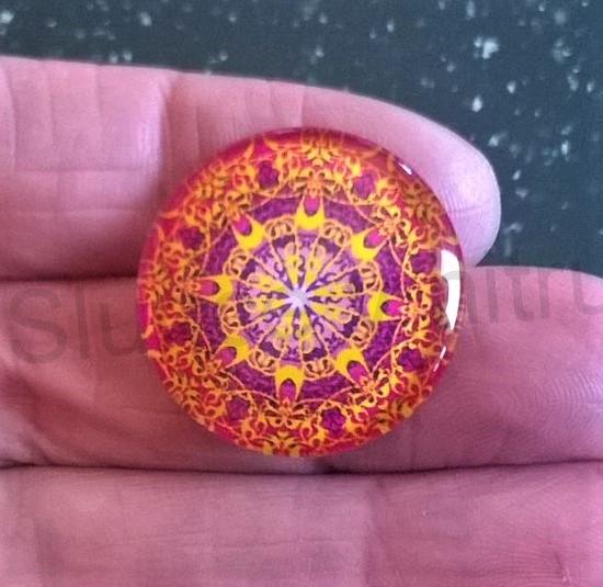 Skleněný kabošon z čirého skla s vlepeným grafickým motivem, má rovnou hladkou plošku k nalepení, vhodné na přilepení na lůžko, textil nebo jako ozdoba.