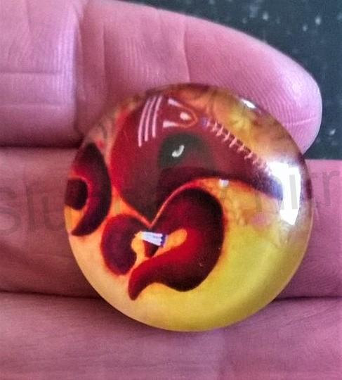 Skleněný kabošon z čirého skla s vlepeným grafickým motivem, má rovnou hladkou plošku k nalepení, vhodné na přilepení na lůžko, textil nebo jako ozdoba.
