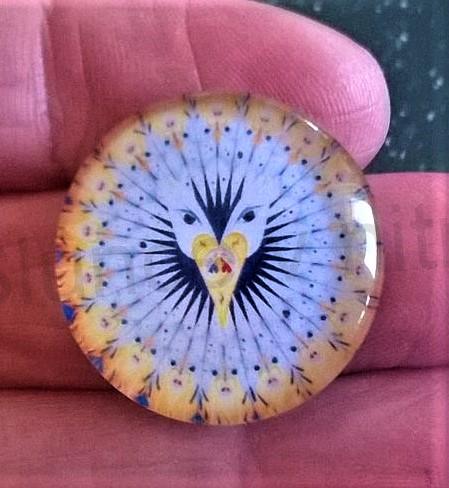 Skleněný kabošon z čirého skla s vlepeným grafickým motivem, má rovnou hladkou plošku k nalepení, vhodné na přilepení na lůžko, textil nebo jako ozdoba.