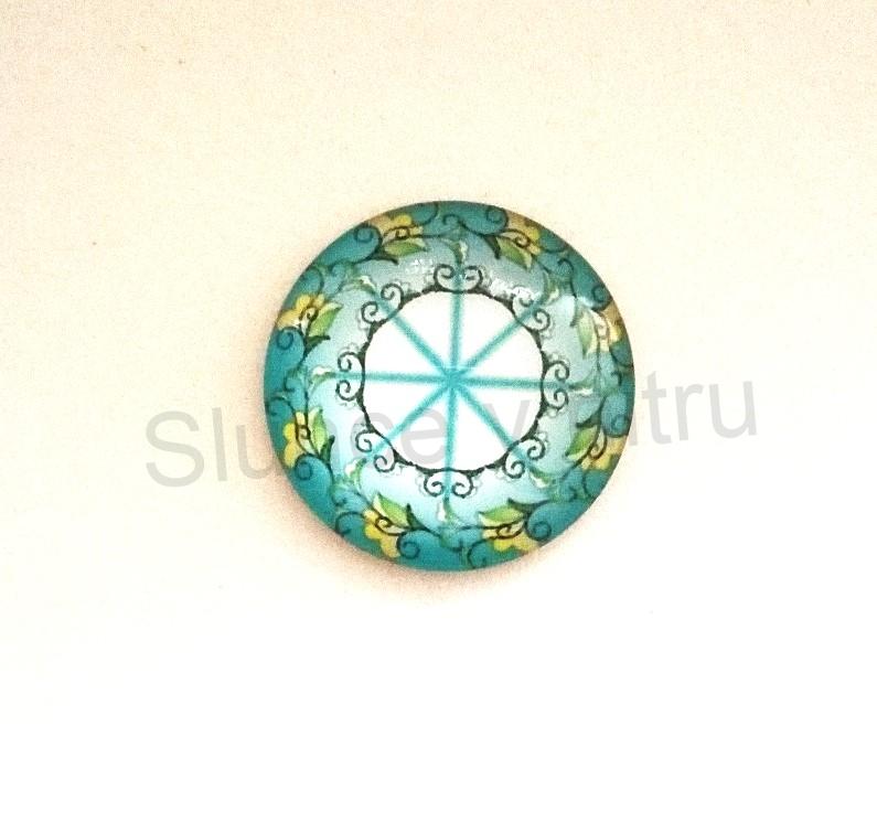 Skleněný kabošon z čirého skla s vlepeným grafickým motivem, má rovnou hladkou plošku k nalepení, vhodné na přilepení na lůžko, textil nebo jako ozdoba.