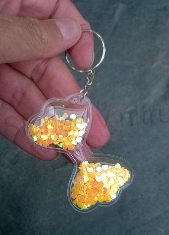 Krásný motiv klíčenky jako mašle, mašličky s barevnými flitry, Flitry (malá srdíčka) jsou pohyblivé, může to být i zábava formou hraní, nebo pozorovat jak se flitry posouvají jako přesýpací hodiny. Dobrá relaxace při dlouhém čekání.