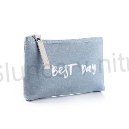 Příležitostní velká taštička s nápisem, na mobil, kosmetiku, klíče od auta, doklady, platební karty, jako peněženka. Taštička se dobře zapíná na zip, zajištěno velkým poutkem, pro dobrý uchyt prstů. Vnitřek lze omýt. Možno použít i jako penál.