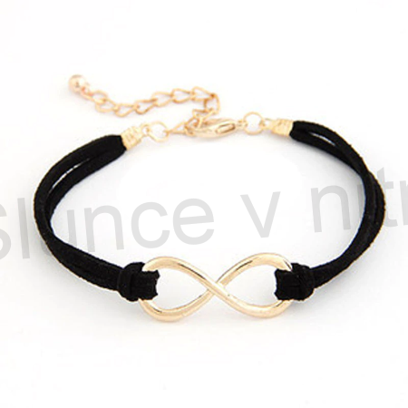 Stylový náramek v černém šňůrkovém provedením, kůže s ozdobou Nekonečna. Kovové komponenty jsou z velmi kvalitního kovu, s leskem. Díky nastavitelnému řetízku se dobře nosí, uzavirání na karabinku, padne každému a snadno se přizpůsobí. Skvělý dárek, nebo jen tak pro radost.