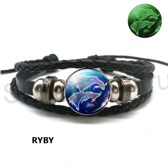 Kožený nastavitelný, náramek s ozdobami pro mladistvé i dospělé s motivem znamení zvěrokruhu, sviticí ve tmě - luminus. Náramek je ručně pletený z kůže, hodí se pro všechny a na každou ruku. Velmi moderní provedení. Náramky, jsou příjemné na dotek. Vhodné jak pro muže, tak pro ženy.