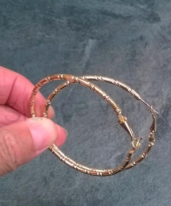 Elegantní náušnice, ve zlaté barvě jemné zlacení, jim dodává luxusní vzhled, ve tvaru nadčasových kruhů, vnější průměr je cca 5,8 cm, zdobený povrch vypadá jednoduše dokonale, bezpečné zapínání na zatlačení do očka, brání ztrátě náušnic, oživte svůj outfit ve velkém stylu.