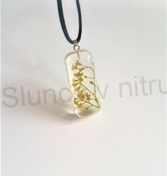 Unikatní květinový přívěšek z přirodních květin, na přívěšek si můžete dát jak šňůrku, tak řetízek. Kytičky jsou trhané námi, které si pečlivě vybíráme v jihomoravském kraji. Mohou se vyskytnout bublinky, které nejsou na škodu, spíše tvoří zajimavý efekt.