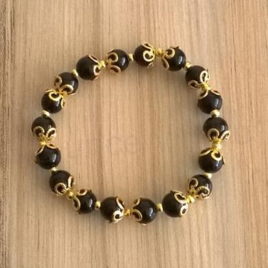 Onyxový pozlacený náramek. Náramek je na dvojité gumičce, dobře drží a snadno se přizpůsobí. Kovové komponenty jsou z velmi kvalitního pozlaceného, galvanizováného kovu. Náramek je moderní, hodí se ke všem modním doplňkům.