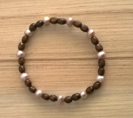 Minerální náramek s řiční perlou a dřevěnýma přírodníma korálkama různých tvarů. Náramek je na dvojité gumičce, dobře drží a snadno se přizpůsobí. Náramek je moderní, hodí se ke všem modním doplňkům.
