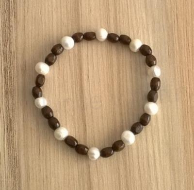 Minerální náramek s řiční perlou a dřevěnýma přírodníma korálkama různých tvarů. Náramek je na dvojité gumičce, dobře drží a snadno se přizpůsobí. Náramek je moderní, hodí se ke všem modním doplňkům.