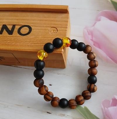 Tento minerální náramek je harmonickým spojením přírodních dřevěných korálků, černého achátu a resinových korálků imitujících jantar. Kombinace přírodních materiálů vytváří elegantní, moderní a univerzální doplněk vhodný pro ženy i muže. Náramek je navlečen na pevné pružné gumičce, která dobře drží tvar, pohodlně se přizpůsobí zápěstí a při běžném nošení nehrozí její poškození. Korálky jsou hladké, příjemné na dotek a náramek se nosí velmi pohodlně — často ani nevíte, že ho máte. Každý kus je originál, ručně vyrobený s důrazem na detail. Pro dlouhou životnost doporučujeme vyhnout se dlouhodobému namáčení.