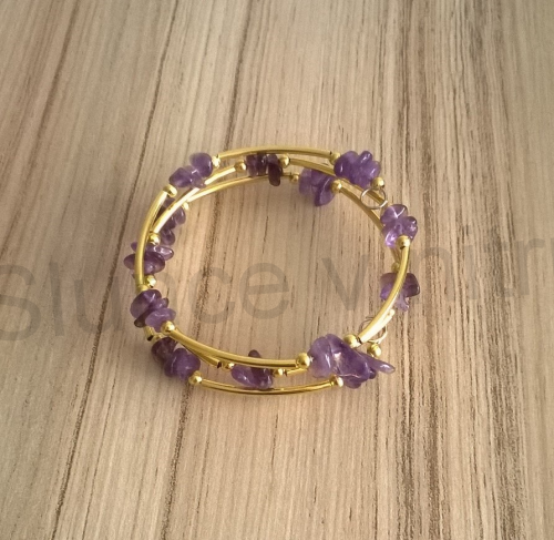 Minerální náramek s ametystem a pozlacenýmii komponenty. Náramek je tvořen z paměťového drátku, na kterém jsou navléknuté minerální zlomky ametystu a pozlacené kovové trubičky s pozlacenými kovovými kuličkami. Náramek má tři otočky a je otevřený, tím pádem je snadné ho návleci na ruku a pak zase sundat. Ametyst je navlečen pravidelně, takže dobře ladí s ostaníma řadama. Na ruce vypadá moc hezky. Náramek budí pozornost okolí pro jeho originalitu.