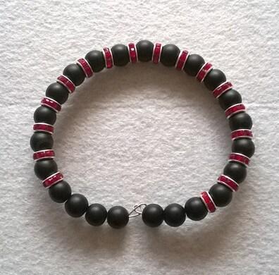 Minerální náramek s černým achátem a šatonové rondely třpytivě červené. Náramek je tvořen z kuliček, tak aby se přizpůsobil pro každého. Náramek je na paměťovém drátku, dobře drží a přizpůsobí se každé ruce.