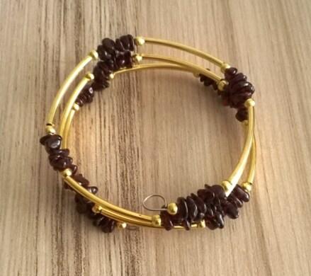 Minerální náramek s granátem a pozlacenými komponenty. Náramek je tvořen z paměťového drátku, na kterém jsou navléknuté minerální zlomky granátu a pozlacené kovové trubičky s pozlacenými kovovými kuličkami. Náramek má tři otočky a je otevřený, tím pádem je snadné ho návleci na ruku a pak zase sundat. Granát je navlečen pravidelně, takže dobře ladí s ostaníma řadama. Na ruce vypadá moc hezky. Náramek budí pozornost okolí pro jeho originalitu.