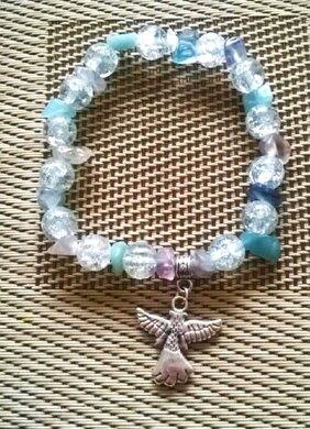 Minerální náramek s Andělem, andílek, anděl s křišťálovými kuličkami, avanturínovými a fluoridovými zlomky, je navržen tak, ab se přizpůsobil jak pro dámy, tak pro pány. Náramek je na dvojité gumičce, dobře drží a přizpůsobí se.