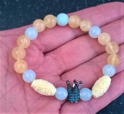 Minerální náramek s měsičním kamenem, citrínem a zirkovonou ozdobou do tvaru korunky, zirkonová korunka je v černé barvě zdobená modrými lesklými zirkonky. A imitace korálu v ozdobných bilých oválků. Náramek je na gumičce, dobře drží a snadno se přizpůsobí. Náramek je moderní, hodí se ke všem modním doplňkům.