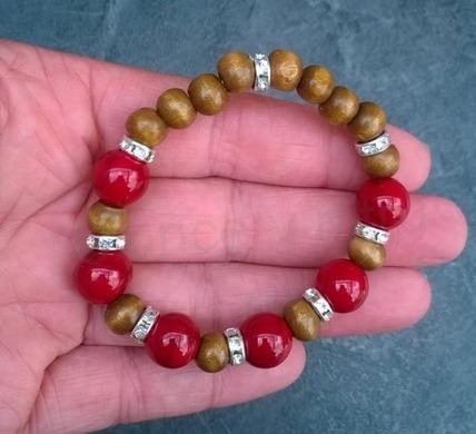 Minerální náramek s tyrkenitem a dřevěnýma přírodníma korálkama prokládané zirkonovými rondelkami. Náramek je na dvojité gumičce, dobře drží a snadno se přizpůsobí. Náramek je moderní, hodí se ke všem modním doplňkům.