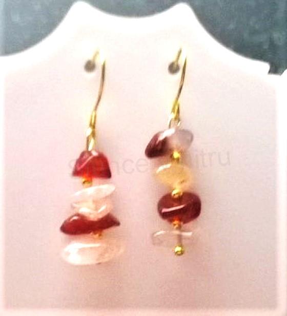 Náušnice tvoří karneolové minerální zlomky. Také jsou tvořeny z klasických afroháčků, které jsou zakončeny silikonovou puzetkou. Silikonové puzetky zabraňujé ztrátě náušnic. Každý pár náušnic je originál. Každý kámen je jiný.