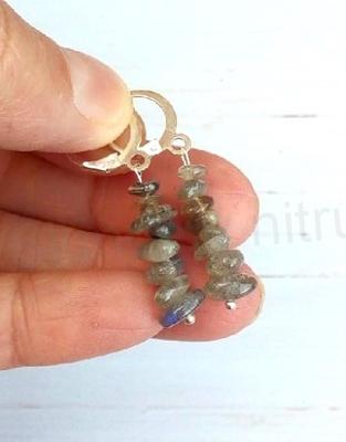 Nádherné labradoritové náušnice. Náušnice tvoří přírodní minerální zlomky, vysoké kvality. Také jsou tvořeny z chirurgických komponentů, ve stříbrné barvě, hlavně háčků, které jsou zakončeny na zacvaknutí v podobě kroužků.