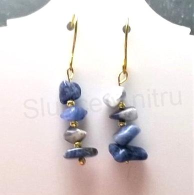 Náušnice tvoří sodalitové minerální zlomky. Také jsou tvořeny z klasických afroháčků, které jsou zakončeny silikonovou puzetkou. Silikonové puzetky zabraňujé ztrátě náušnic. Každý pár náušnic je originál. Každý kámen je jiný.