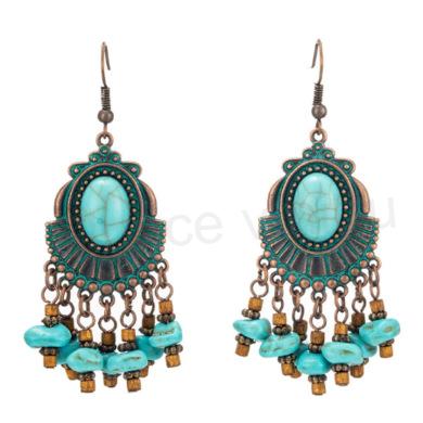 Nádherné visací tyrkenitové náušnice. Náušnice tvoří tyrkenitové minerální zlomky, kabošony do tvaru oválků, vysoké kvality. Také jsou tvořeny z modrého smaltování, na klasických afroháčku, které jsou zakončeny silikonovou puzetkou. Silikonové puzetky zabraňujé ztrátě náušnic. Etnický český styl Bohemia.