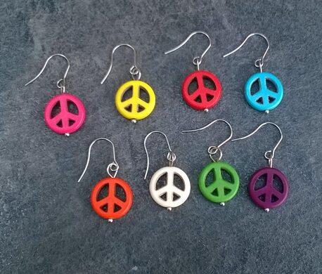 Nádherné tyrkysové náušnice z chirurgické oceli. Náušnice tvoří minerální ozdoby se symbolem mírů. Také jsou tvořeny z chirurgické oceli - komponenty, k náušnicím dostanete silikonové puzetky. Silikonové puzetky zabraňujé ztrátě náušnic. Prosím berte na vědomí, foto je jen ilustrační, každý pár náušnic je originál. Každý kámen je jiný.