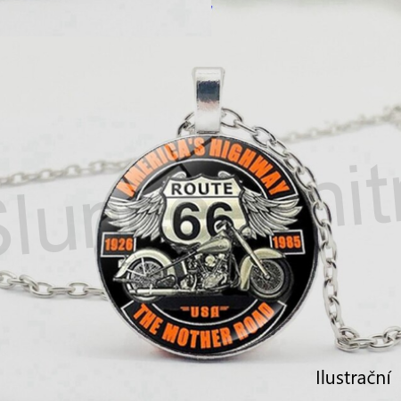 Řetízkové provedení náhrdelníku v motivu moto - Route 66 - America s Highway 1923 - 1985 The Mother Head. Řetízek je zakončený karabinkou, přívěšek je z chirurgické oceli, řetízek z galvanizovanýho kovu.