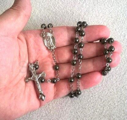 Růženec pro věřící lidí, při modlitbě, jako posvěcený předmět, že nositel chce patřit Bohu, opět chránící před zlým duchem a zároveň vyznávající. I jako ochranný amulet, chránící před zlým duchem. Ručně ketlovaný náhrdelník z Hematitových korálků a Kristusky - Svátosky a Křížkem, oboje vypracované do detailů.
