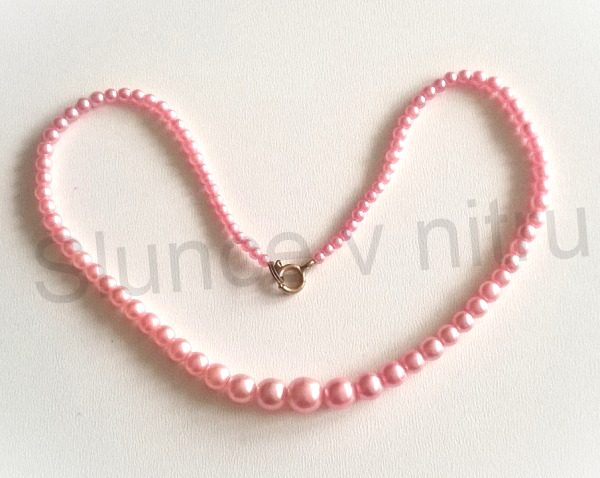 Tento starožitný krásný perličkový, korálkový, retro, náhrdelník z korálků AB - imitace perliček, barvy růžové perlové, podtrhne vaši osobnost a zvýrazní obličej. Perleťové korálky jsou prokládané uprostřed většími perličkami, tak aby vše ladilo. Náhrdelník má kovové zapínání, barvy jemně zlaté. Nádherný šperk naší historie, náhrdelník se hodí na každodenní nošení, či oslavy.