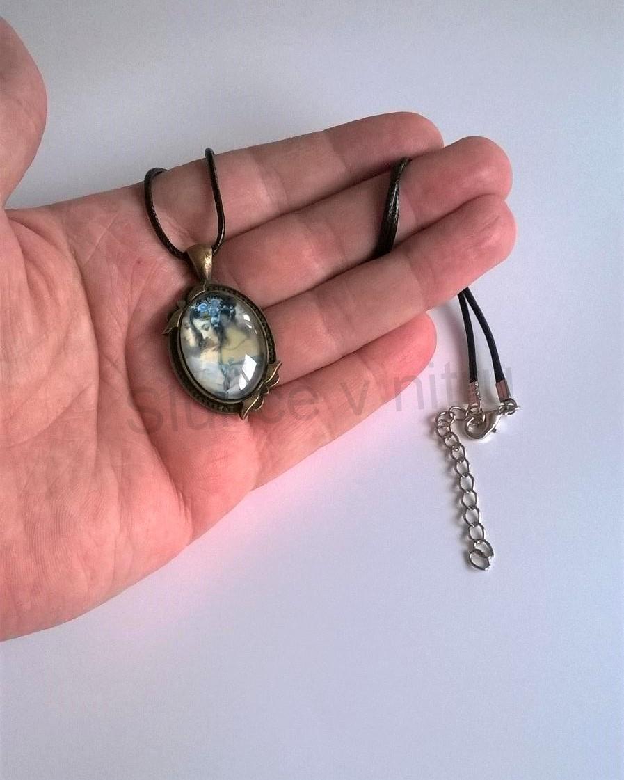 Nádherné šňůrkové provedení náhrdelníku s přívěškem postavy, dívky, postava, dívka. Náhrdelník je velmi modní, pro všechny věkové kategorie. Voskovaná kožená šňůrka je zakončená karabinkou, přívěšek je z kvalitního kovu, a kabošon. Přívěšek na světle odraží lesk, krásně se leskne.