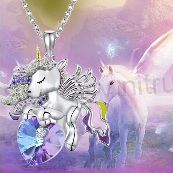 Jemný řetízek s přívěskem jednorožce, koníka, které ukryvá velký krystal Swarovski element, spojený dohromady. Krystal je vsazen uvnitř bezpečně, nehrozí, že by vypadl. Velmi vhodný dárek, nebo skvělý elegantní modní doplněk, vhodný i pro děti.