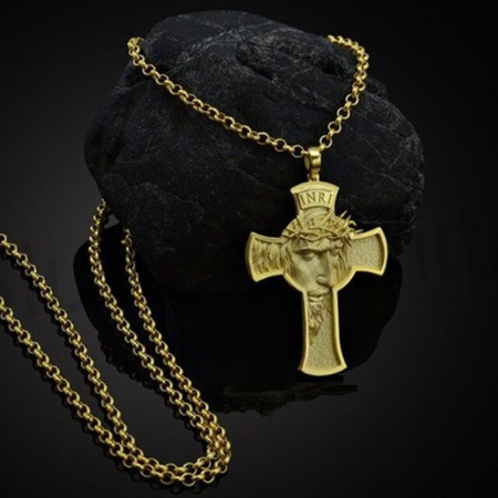 Krásný dlouhý řetízkový náhrdelník s přívěškem kříže. Řetízek je z chirurgické oceli, zapínaní na karabinku plus přídavný řetízek. Kříž je ve zlaté barvě. Uvnitř kříže náznak jesuse. Krásné provedení, kříž je z kvalitního galvanizováného kovu, umělecká ruční práce ( umělecké kovářství).