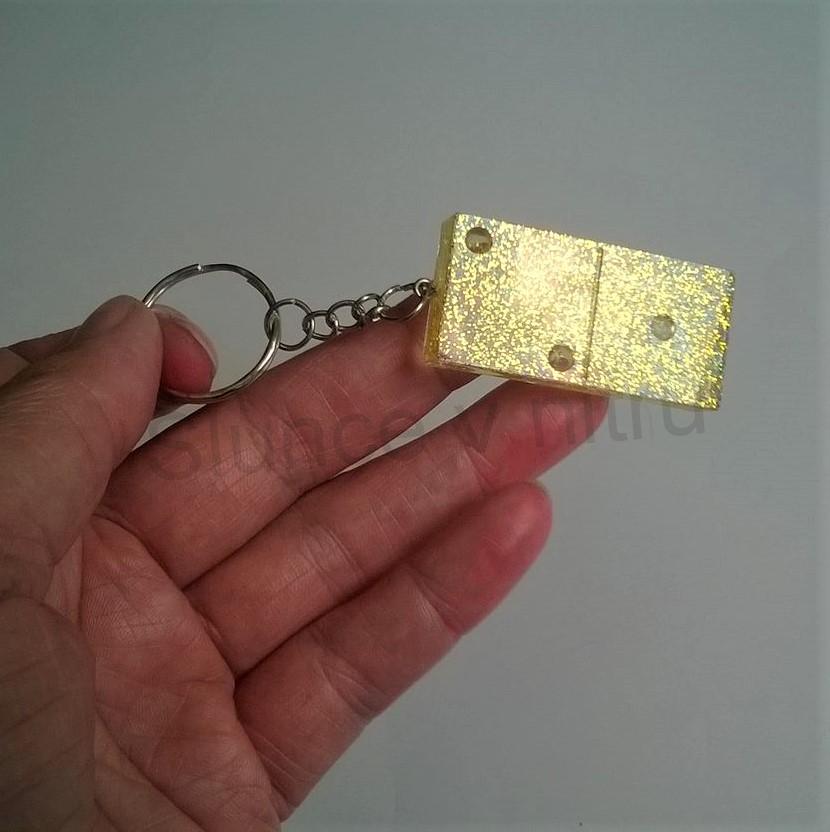 Unikatní pryskyřičná klíčenka domino - orgonit. Klíčenka je jako skutečné domino, kde každá má svoje puntíky, tečky na dominu. Krasný dárek, i jako dekorace.Každá klíčenka je jiná, podle vyražených puntíků, výběr je na vás kterou si zvolíte. Mohou se vyskytnout bublinky, které nejsou na škodu, spíše tvoří zajimavý efekt.
