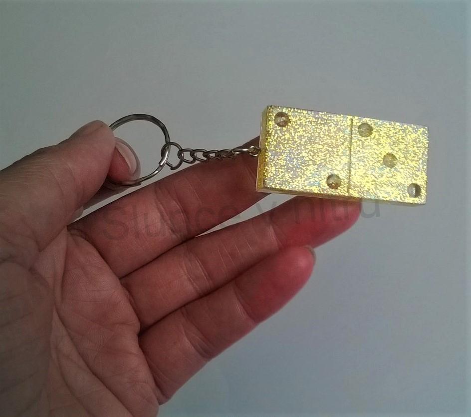 Unikatní pryskyřičná klíčenka domino - orgonit. Klíčenka je jako skutečné domino, kde každá má svoje puntíky, tečky na dominu. Krasný dárek, i jako dekorace.Každá klíčenka je jiná, podle vyražených puntíků, výběr je na vás kterou si zvolíte. Mohou se vyskytnout bublinky, které nejsou na škodu, spíše tvoří zajimavý efekt.