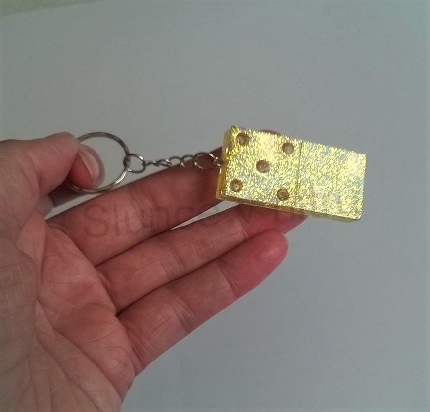 Unikatní pryskyřičná klíčenka domino - orgonit. Klíčenka je jako skutečné domino, kde každá má svoje puntíky, tečky na dominu. Krasný dárek, i jako dekorace.Každá klíčenka je jiná, podle vyražených puntíků, výběr je na vás kterou si zvolíte. Mohou se vyskytnout bublinky, které nejsou na škodu, spíše tvoří zajimavý efekt.