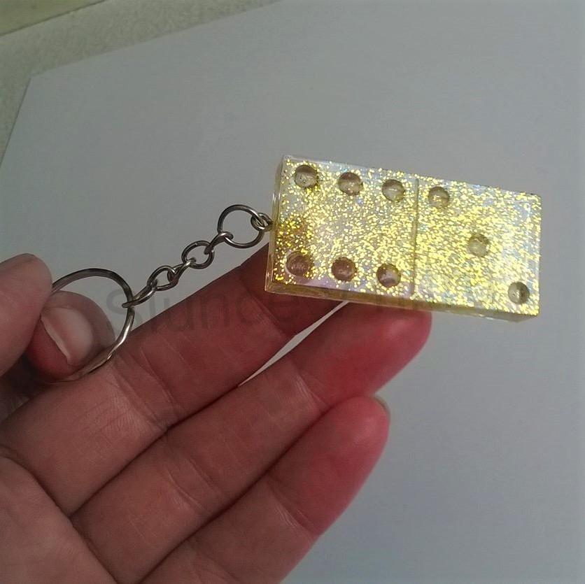 Unikatní pryskyřičná klíčenka domino - orgonit. Klíčenka je jako skutečné domino, kde každá má svoje puntíky, tečky na dominu. Krasný dárek, i jako dekorace.Každá klíčenka je jiná, podle vyražených puntíků, výběr je na vás kterou si zvolíte. Mohou se vyskytnout bublinky, které nejsou na škodu, spíše tvoří zajimavý efekt.