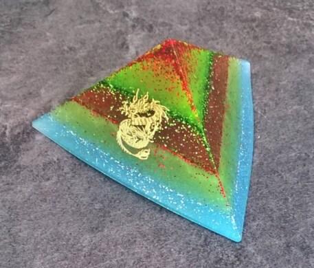 Orgonitová pyramida - ohnivá dračí energie, drak. Krasný dárek, i jako dekorace. Mohou se vyskytnout bublinky, které nejsou na škodu, spíše tvoří zajimavý efekt.