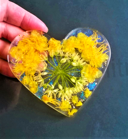 Unikatní pryskyřičné srdce, srdíčko z přirodních květin, které slouží i zároven jako tácek, či podtácek. Kytičky jsou trhané námi, které si pečlivě vybíráme v jihomoravském kraji. Srdce má i na zadní straně gumové podložky, před poškozením. Na podtácek, tácek můžete bez problému pokládat studené i teplé skleničky, hrníčky. Krasný dárek, i jako dekorace. Mohou se vyskytnout bublinky, které nejsou na škodu, spíše tvoří zajimavý efekt.
