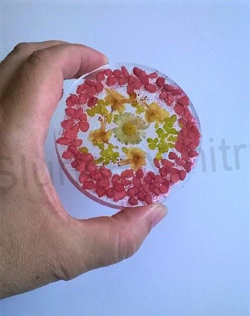 Unikatní pryskyřičné kolečko, z přirodních květin a kamínky, které slouží i zároven jako tácek, či podtácek. Kytičky jsou trhané námi, které si pečlivě vybíráme v jihomoravském kraji. Na podtácek, tácek můžete bez problému pokládat studené i teplé skleničky, hrníčky. Krasný dárek, i jako dekorace. Mohou se vyskytnout bublinky, které nejsou na škodu, spíše tvoří zajimavý efekt.