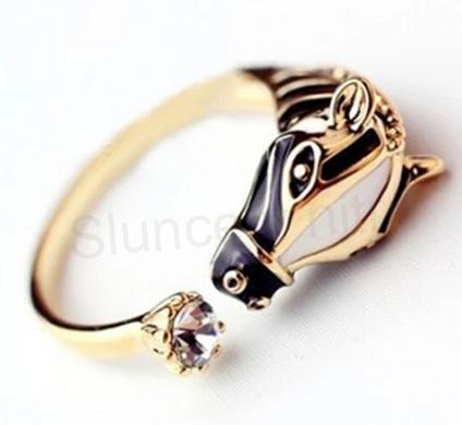 Zajimavý otevřený retro prsten s hlavou koně a čirím kamínkem, ručně vyroben, bižuterní kov. Hlava má barevné smaltovaní.