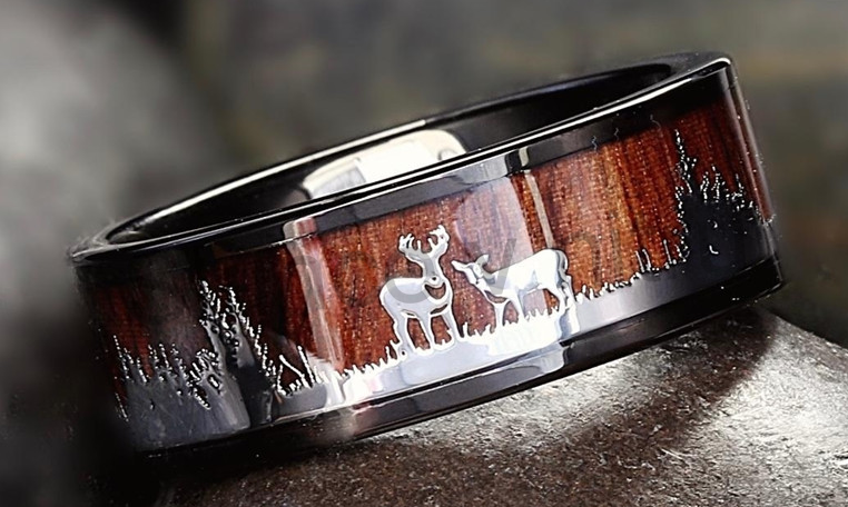 Elegantní snubní prsten s kombinací wolframu a dřeva. Tato kombinace působí velmi nadčasově. Uprostřed prstenu je siuleta Jelena se srnou na dřevěném podkladě. Prsten je pevný a dokonalý, není barvený. Dokonalý dárek pro milovníky přírody.