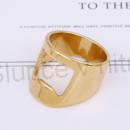 Zásnubní, snubní, modní, punc prsten jako otvirák z chirurgické oceli, lesklý, zlaté barvy. Vysoké kvality, aby dobře vynikla jeho krása a lesk. na světle odraží lesk. Prsten je originální, má dvě funkce buď jako modní doplněk, nebo užitečný pomocník, když je potřeba otevřít nějakou láhev. Jistě ocení i milovníci piva. Prsten je vhodný ke všem ostatním šperkům a pro všechny události.