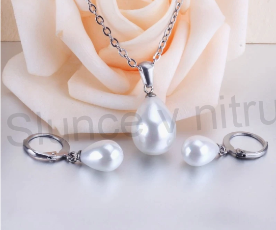 Postříbřená luxusní souprava s perlou kapka. Soupravu tvoří náušnice a přívěsek s řetízkem, které jsou zdobeny perlou swarovski. Náušnice mají kruhové zapínání. Souprava obsahuje jedny náušnice, přivěšek a řetízek. Celá sada je rhodiována, dodává šperkům luxusní vzhled a zárověn chraní před jeho přirozenou oxidací. Souprava na světle odraží lesk, perfektně se hodí na zvláštní příležitosti, či každodenní nošení. Jemný šperk pro vás.